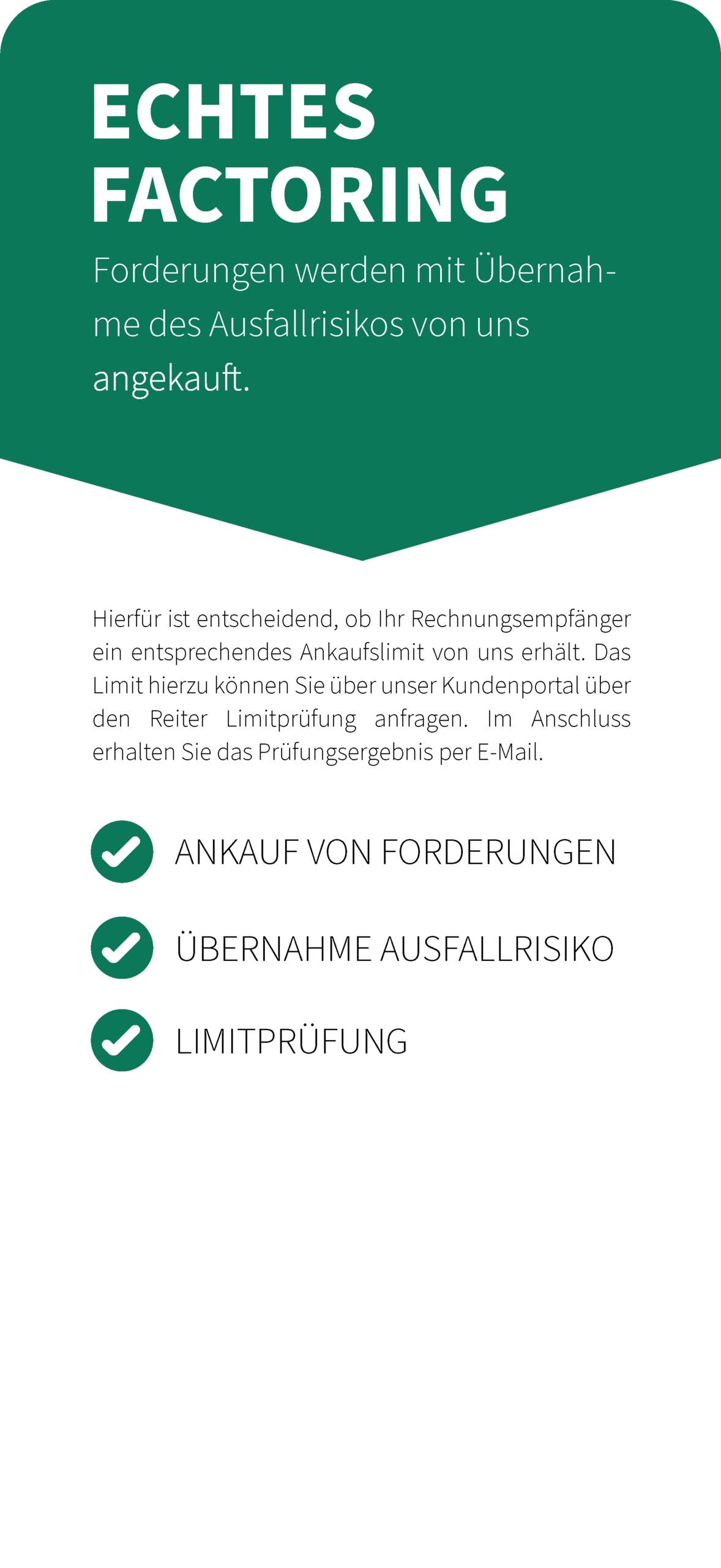 Factoring bedeutet, dass wir als RHD Rechnungsstelle AG Ihre offenen Forderungen sofort auszahlen – unabhängig davon, wann Ihr Kunde bezahlt. Gleichzeitig übernehmen wir das Debitorenmanagement, das Mahnwesen und das Ausfallrisiko. Sie konzentrieren sich auf Ihr Geschäft – wir kümmern uns um Ihre Rechnungen.